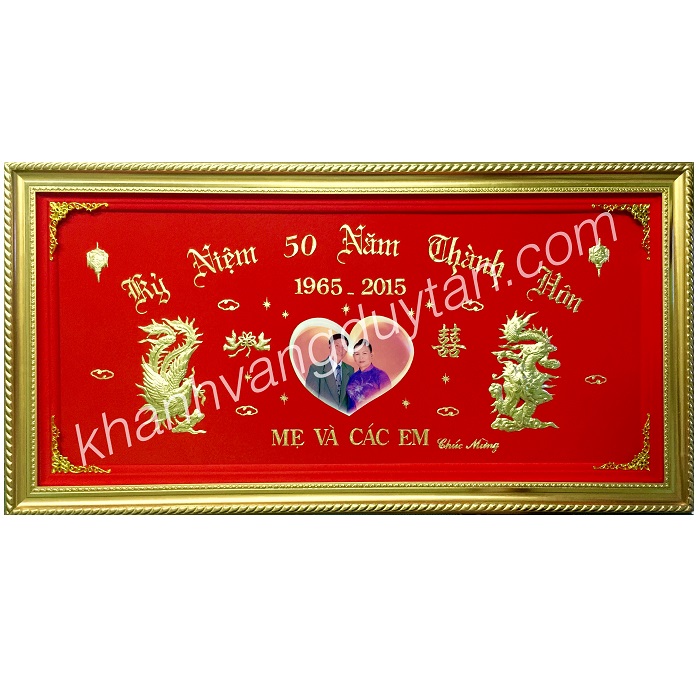 Quà mừng kỷ niệm ngày cưới Bố Bẹ tranh vàng 24k sang trọng, nội dung đặt theo yêu cầu hình Rồng Phụng và tên Bố Mẹ, năm kỷ niệm ngày thành thông của bố mẹ và trang trí các họa tiết, biểu trưng cho hạnh phúc gia đình: Đôi chim uyên ương, chữ song Hỷ,...